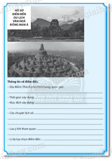 Đông Nam Á ngày nay đang là một điểm đến hấp dẫn du khách quốc tế. Các công ty du lịch cần mua một bộ hồ sơ về hai điểm đến du lịch văn hoá của khu vực Đông Nam Á có những công trình kiến trúc cổ nhất còn lại đến ngày nay. Em hãy xây dựng bộ hồ sơ về hai công trình kiến trúc đó theo những gợi ý sau: