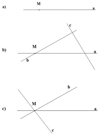 b) Điểm M thuộc hai đường thẳng a và b nhưng không thuộc đường thẳng c.