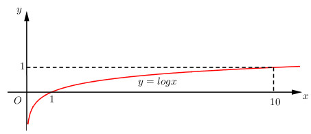 Đồ thị hàm số nằm hoàn toàn bên phải trục tung) nhận trục tung làm tiệm cận đứng, cắt trục hoành tại điểm \((1;0)\) và đi qua điểm \((10;1)\), \((\dfrac{1}{10}; -1)\).