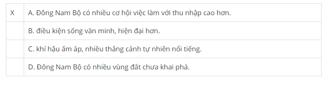 Giải bài 4 trang 79 vở bài tập Địa lí 9, Đánh dấu (X) vào ý đúng nhất. Đông Nam Bộ có sức hút mạnh mẽ với lao động cả nước do A. Đông Nam Bộ có nhiều cơ hội việc làm với thu nhập cao hơn. B. điều kiện sống văn minh, hiện đại hơn. C. khí hậu ấm áp, nhiều thắng cảnh tự nhiên nổi tiếng. D. Đông Nam Bộ có nhiều vùng đất chưa khai phá.