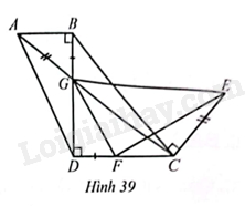 Hình thang \(ABCD\) ở Hình 39 có \(AB//CD,AB < CD,\widehat {ABD} = 90^\circ \). Hai đường chéo \(AC\) và \(BD\) cắt nhau tại \(G\). Điểm \(E\) nằm trên đường vuông góc với \(AC\) tại \(C\) thỏa mãn \(CE = AG\) và đoạn thẳng \(GE\) không cắt đường thẳng \(CD\). Điểm \(F\) nằm trên đoạn thẳng \(DC\) và \(DF = GB\). Chứng minh: