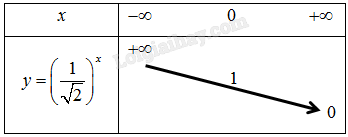 b) Vì hàm số \(y = {\left( {\frac{1}{{\sqrt 2 }}} \right)^x}\) có cơ số \(\frac{1}{{\sqrt 2 }} < 1\) nên ta có bảng biến thiên như sau: