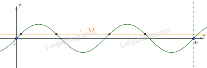 Nhìn vào hình vẽ, ta thấy đường thẳng \(y = 0,3\) cắt đồ thị \(y = \sin x\) tại 4 điểm có hoành độ ở trên khoảng \(\left( {0;4\pi } \right)\). Có nghĩa là phương trình \(\sin x = 0,3\) có 4 nghiệm ở trên khoảng \(\left( {0;4\pi } \right)\).