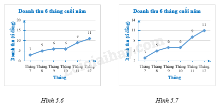 b) Không thể căn cứ vào độ dốc trên của hai đường gấp khúc trên hai biểu đồ để đánh giá về tốc độ tăng doanh thu trong 6 tháng cuối năm của dữ liệu được biểu diễn do gốc trục đứng và độ dài trên trục đứng của hai biểu đồ khác nhau.