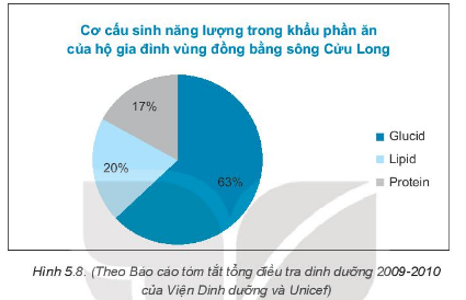 Cho biểu đồ Hình 5.8 a) Hãy cho biết thành phần nào sinh năng lượng nhiều nhất trong khẩu phần ăn của hộ gia đình vùng đồng bằng sông Cửu Long. b) Lập bảng thống kê biểu diễn số liệu trong biểu đồ này.