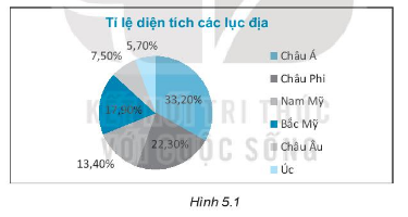 Cho biểu đồ Hình 5.1 a) Cho biết tiêu đề của biểu đồ này. b) Hình tròn trong biểu đồ được chia thành mấy hình quạt? Mỗi hình quạt biểu diễn số liệu nào? c) Lục địa nào có diện tích lớn nhất? Chiếm bao nhiêu phần trăm? d) Tổng diện tích của các lục địa trên là 134 triệu km2. Tính diện tích của lục địa Châu Á, Châu Âu.