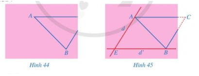 Bạn Hoa vẽ tam giác ABC lên tờ giấy sau đó cắt một phần tam giác ở phái góc (Hình 44). Bạn Hoa đó bạn Hùng: Không vẽ lại tam giác ABC, làm thế nào tính được độ dài đoạn thẳng AC, BC và số đo góc ACB? Bạn Hùng làm như sau: – Qua điểm A kẻ đường thẳng d song song với BC; qua điểm B kẻ đường thẳng d’ song song với AC. – Gọi E là giao điểm của d và d’. – Đo độ dài các đoạn thẳng AE, BE và đo góc AEB. Từ đó, tính được độ dài các đoạn thẳng AC, BC và số đo góc ACB (hình 45). Em hãy giải thích