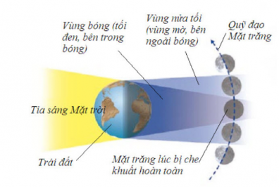 – Nhật thực: Khi Mặt Trời, Mặt Trăng và Trái Đất cùng nằm trên một đường thẳng, mặt trăng ở giữa thì trên Trái Đất xuất hiện bóng tối và bóng nửa tối.