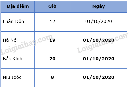 – Tính giờ của Hà Nội, Bắc Kinh và Niu Ioóc khi Luân Đôn đang là 12 giờ (01/10/2020).