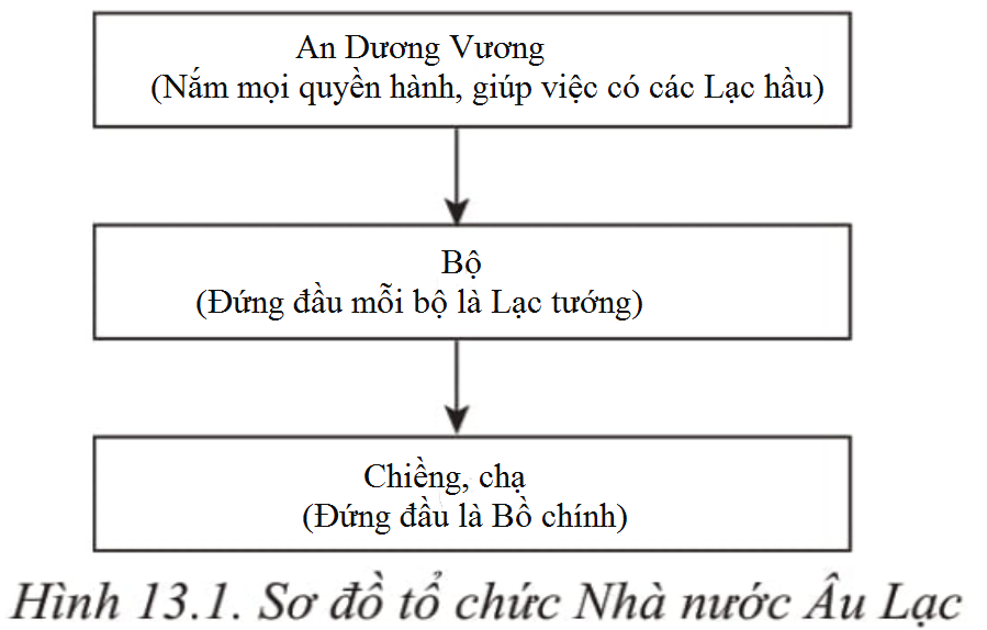 Đặt các từ ngữ cho sẵn vào các ô A, B, C để boàn thành sơ đồ tổ chức nhà nước Âu Lạc. Hãy chỉ ra những điểm giống và khác nhau giữa tổ chức Nhà nước Âu Lạc và tổ chức Nhà nước Văn Lang. (1) Bộ (Đứng đầu mỗi bộ  là Lạc tướng): (2) Chiềng, chạ (Đứng đầu là Bồ chính), (3) An Dương Vương (Nắm mọi quyền hành, giúp việc có các Lạc hầu).