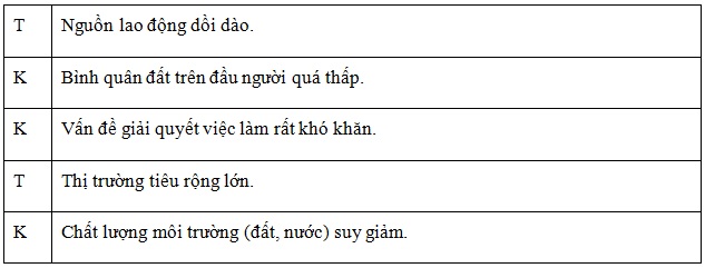Giải bài 5 trang 51 vở bài tập Địa lí 9, Viết chữ T vào ô trống thể hiện thuận lợi, chữ K vào ô trống thể hiện khó khăn. Mật độ dân số cao đưa lại những thuận lợi và khó khăn gì cho việc phát triển kinh tế – xã hội ở Đồng bằng sông Hồng?