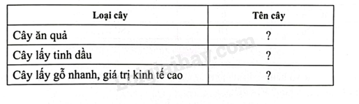 Bác Toàn đã trồng trong vườn các loại cây sau: cây ăn quả (cây cam, cây mít, cây nhãn, cây ổi, cây na); cây lấy tinh dầu (cây dừa, cây tràm, cây gấc); cây lấy gỗ nhanh giá trị kinh tế cao (cây gỗ xưa, cây lim xanh, cây xoan đào, cây gỗ cẩm lai). Hãy giúp bác Toàn phân loại những cây đã trồng trong vườn theo những tiêu chí sau: