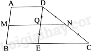 Xét bài toán phụ 2: Cho hình thang ABCD với AD//BC \(\left( {AD < BC} \right)\). Qua điểm D vẽ đường thẳng DE song song với AB (E thuộc BC); gọi N, Q lần lượt là trung điểm của cạnh DC, DE, M là giao điểm của NQ và AB. Chứng minh rằng \(MA = MB\)