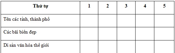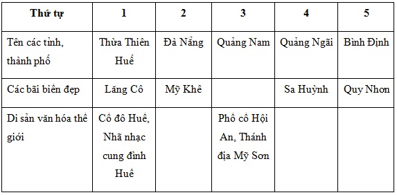 a) Theo hướng từ Bắc vào Nam, hãy điền tên các tỉnh, thành phố với các bãi biển, di sản văn hóa thế giới trong tỉnh, thành phố thuộc vùng kinh tế trọng điểm miền Trung vào bảng sau: