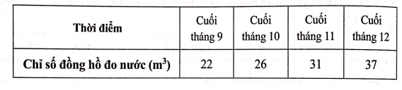 Chỉ số đồng hồ đo nước sinh hoạt cuối các tháng 9,10,11,12 của năm 2020 ở nhà bác Long được thống kê trong bảng sau: