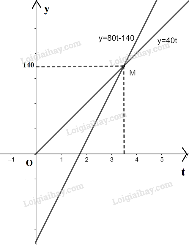 \( \Rightarrow \) Phương trình chuyển động của xe máy là: \(y = {S_1}(t) = 40t\), của ô tô là: \(y = {S_2}(t) = 80t – 140\)