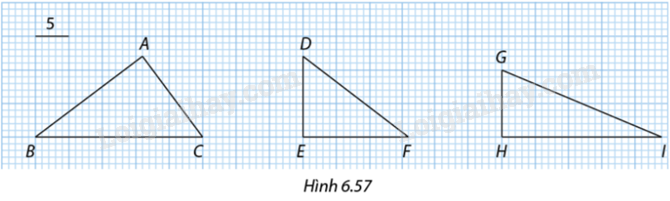 Trong Hình 6.57, độ dài cạnh mỗi ô vuông lớn là \(5\) đơn vị. Tính độ dài các cạnh của \(\Delta ABC,\Delta DEF,\Delta GHI\) và cho biết các tam giác nào đồng dạng với nhau. Viết kí hiệu của sự đồng dạng đó và xác định tỉ số đồng dạng.