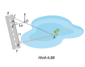 Trong Hình 6.88, để đo khoảng cách \(AB\) từ vị trí \(A\) giữa hồ nước đến đường \(XY\), Nam đi dọc đường đến vị trí C sao cho điểm A, C và chân cột đèn D thẳng hàng. Nam đo được khoảng cách từ D đến đường XY là \(DE = 5,4m\), ngoài ra \(CE = 4m\) và \(BE = 11m\). Tính khoảng cách \(AB\)