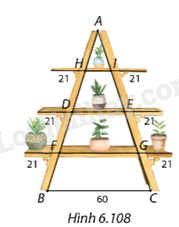 Trong Hình 6.108, kệ gỗ hình tam giác có ba tầng chia mỗi chân \(AB\) và \(AC\) của kệ thành bốn đoạn thẳng bằng nhau. Biết hai chân kệ cách nhau \(60cm\) và mỗi tầng được đóng dư \(21cm\) ra phía ngoài của hai chân. Tính độ dài mỗi tầng kệ.
