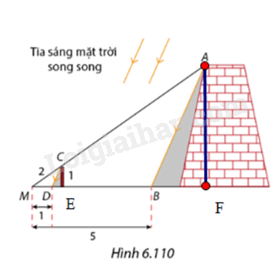 Vào một thời điểm trong ngày, \(B\) và \(D\) lần lượt là các bóng của điểm \(A\) trên mặt thành cổ và điểm \(C\) trên đỉnh cột lên mặt đất, các điểm \(M,C,A\) thẳng hàng và các điểm \(M,D,B\) thẳng hàng (Hình 6.110). Người ta đo được các khoảng cách \(MD = 1m,MB = 5m\) và \(MC = 2m.\)