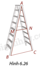 Thang xếp có hai đầu \(M,N\) của thanh khóa thang nằm ở trung điểm của hai chân \(AB\) và \(AC\) (Hình 6.26). Khi thang được mở, đọ dài của thanh khóa \(MN\) là \(30\,cm.\) Tính khoảng cách giữa điểm \(B\) và \(C.\)
