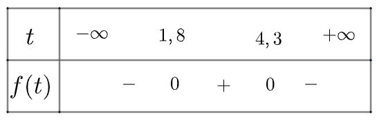 Xét tam thức \(f\left( t \right) =  – 4,9{t^2} + 30t – 38\) có \(\Delta  = 155,2 > 0\), có hai nghiệm phân biệt là \({x_1} \simeq 1,8;{x_2} \simeq 4,3\) và có \(a =  – 4,9 < 0\)
