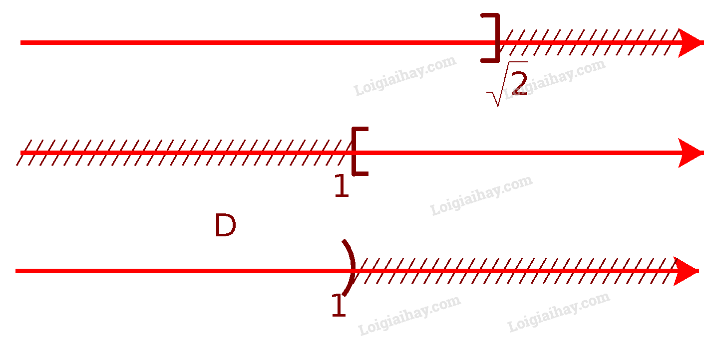 d) Để xác định tập hợp \(D = ( – \infty ;\sqrt 2 ]{\rm{\backslash }}[1; + \infty )\), ta vẽ sơ đồ sau đây: