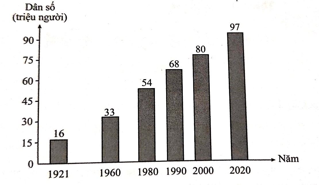 Hình 1 là biểu đồ dân số Việt Nam qua các năm 1921, 1960, 1980, 1990, 2000 và 2020 (đơn vị triệu người)