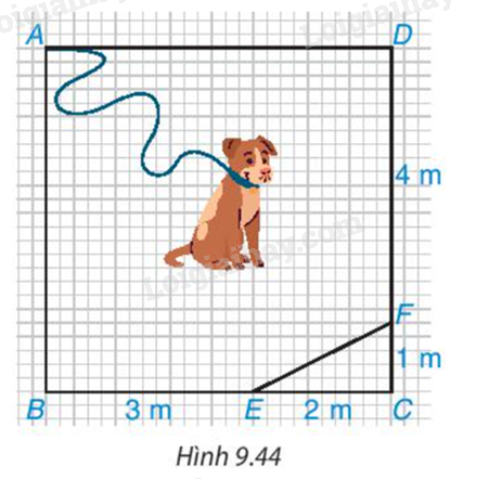 Chú cún bị xích bởi một sợi dây dài 6m để canh một mảnh vườn giới hạn bởi các điểm A, B, E, F, D trong hình vuông ABCD có cạnh 5m như Hình 9.44.