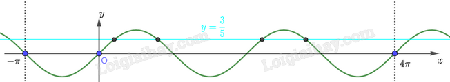 Nghiệm của phương trình trên chính là hoành độ các giao điểm của đường thẳng \(y = \frac{3}{5}\) và đồ thị hàm số \(y = \sin x\) như hình vẽ dưới đây.