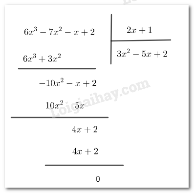 Khi làm phép chia \(\left( {6{x^3} – 7{x^2} – x + 2} \right):\left( {2x + 1} \right)\), bạn Quỳnh cho kết quả đa thức dư là 4x + 2.