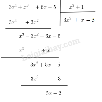 Vậy chia A cho B ta được thương là \(Q = 3{x^2} + x – 3\) và số dư \(R = 5x – 2\).