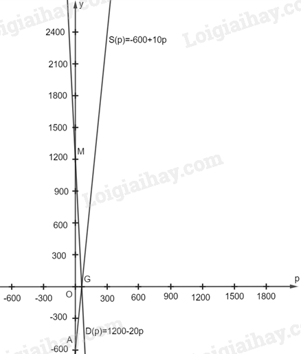 Đồ thị hàm số \(y = D\left( p \right) = 1\,200 – 20p\) đi qua \(M\left( {0;\;1\;200} \right),G\left( {60;0} \right)\)