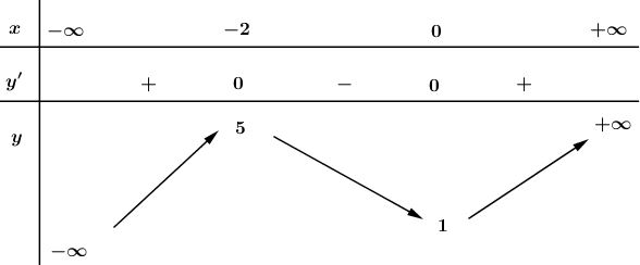 – Hàm số đồng biến trên khoảng \(\displaystyle (-\infty;-2)\) và \(\displaystyle (0;+\infty)\), nghịch biến trên khoảng \(\displaystyle (-2;0)\)