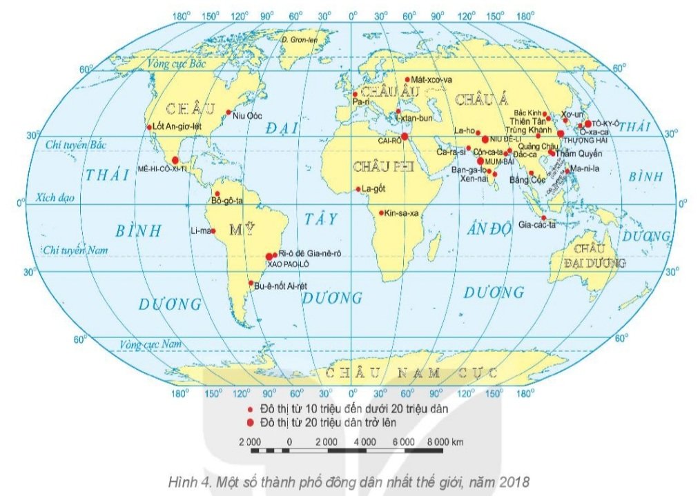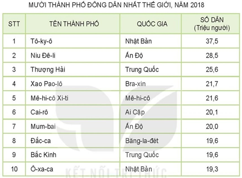 Dựa vào bảng số liệu ở câu 6 (trang63), cho biết: a) Các nước có 2 thành phố nằm trong danh sách mười thành phố đông dân nhất thế giới năm 2018. b) Các châu lục dưới đây có bao nhiêu thành phố nằm trong danh sách mười thành phố đông dân nhất thế giới năm 2018: – Châu Mỹ – Châu Âu – Châu Phi – Châu Á – Châu Đại Dương – Châu Nam Cực