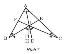 Cho tam giác ABC có ba đường phân giác AD, BE, CF đồng quy tại I. Vẽ IH vuông góc với BC tại H. Chứng minh rằng \(\widehat {BIH} = \widehat {CI{\rm{D}}}\).