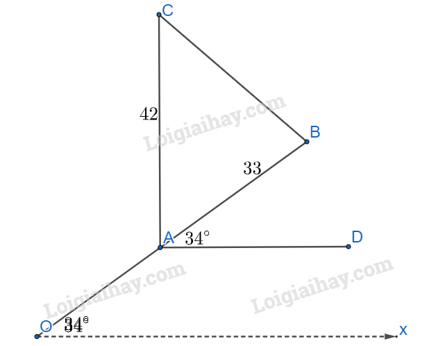 \(BC = \sqrt {A{B^2} + A{C^2} – 2.AB.AC.\cos \widehat {BAC}}  = \sqrt {{{33}^2} + {{42}^2} – 2.33.42.\cos 56^\circ }  \simeq 36,1\)m