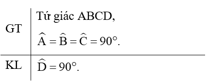 Phát biểu giả thiết, kết luận, vẽ hình minh họa và chứng minh định lí: “Nếu một tứ giác có ba góc vuông thì góc còn lại cũng là góc vuông”.