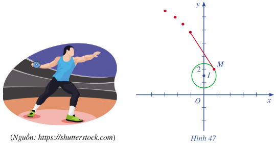 Ném đĩa là một môn thể thao thi đấu trong Thế vận hội Olympic mùa hè. Khi thực hiện cú ném, vận động viên thường quay lưng lại với hướng ném, sau đó xoay ngược chiều kim đồng hồ một vòng rưỡi của đường tròn để lấy đà rồi thả tay ra khỏi đĩa. Giả sử đĩa chuyển động trên một đường tròn tâm \(I\left( {0;\frac{3}{2}} \right)\) bán kính 0,8 trong mặt phẳng toạ độ Oxy (đơn vị trên hai trục là mét). Đến điểm\(M\left( {\frac{{\sqrt {39} }}{2};2} \right)\), đĩa được ném đi (Hình 47). Trong những giây đầu tiên ngay sau khi được ném đi, quỹ đạo chuyển động của chiếc đĩa có phương trình như thế nào?