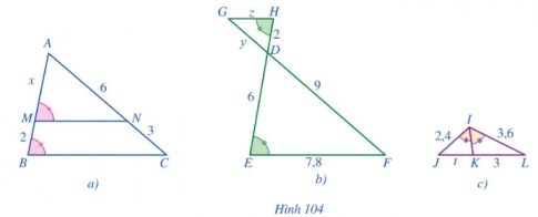 Tính các độ dài x, y, z, t ở các hình 104a, 104b, 104c.