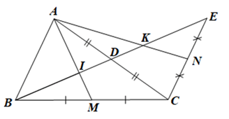 Cho tam giác ABC có đường trung tuyến BD. Trên tia đối của tia DB lấy điểm E sao cho DE = BD. Gọi M, N lần lượt là trung điểm của BC, CE. Gọi I, K lần lượt là giao điểm của AM, AN với BE. Chứng minh BI = IK = KE.
