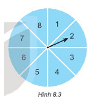Một tấm bìa cứng hình tròn được chia làm tám phần có diện tích bằng nhau và ghi các số 1; 2; 3; 4; 5; 6; 7; 8; được gắn vào trục quay có mũi tên như hình 8.3