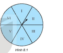 Một tấm bìa cứng hình tròn được chia làm sáu phần có diện tích bằng nhau và ghi các số La Mã I, II, III, IV, V, VI, được gắn vào trục quay có mũi tên ở tâm như Hình 8.1. Bạn Hiền quay tấm bìa.