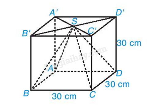 Từ một khúc gỗ hình lập phương cạnh 30 cm, người ta cắt đi một phần gỗ để được phần còn lại là một hình chóp tứ giác đều có đáy là hình vuông cạnh 30 cm và chiều cao của hình chóp cũng bằng 30 cm.