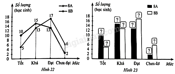 Biểu đồ đoạn thẳng ở Hình 22 biểu diễn số lượng học sinh đạt kết quả học tập Học kì I mức Tốt, Khá, Đạt, Chưa đạt của mỗi lớp 8A, 8B. Hãy hoàn thiện Hình 23 để nhận được biểu đồ cột kép biểu diễn các dữ liệu trong biểu đồ đoạn thằng ở Hình 22.