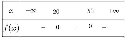Xét tam thức \(f\left( x \right) =  – 30{x^2} + 2100x – 30000\) có \(\Delta  = 810000 > 0\), có hai nghiệm phân biệt là \({x_1} = 20,{x_2} = 50\) và \(a =  – 30 < 0\)