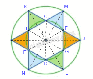 Ta thấy đường tròn nhỏ tâm O có các đường kính CD, EF, GH nên O là trung điểm của CD, EF, GH. Đường tròn lớn tâm O có các đường kính MN, LK, IJ nên O là trung điểm của MN, LK, IJ.