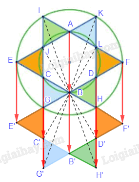 – Phép tịnh tiến theo vectơ \(\overrightarrow {AB} \) biến các tam giác IAJ, EJC, CGB, AKL, LDF, BDH lần lượt thành các tam giác CBG, E’GC’, C’G’B’, BDH, HD’F’, B’D’H’.