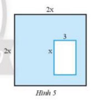 Cho hình vuông cạnh 2x và bên trong là hình chữ nhật có độ dài hai cạnh là x và 3 (Hình 5). Tìm đa thức theo biến x biểu thị diện tích của phần được tô màu xanh