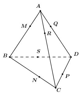 Giả sử tứ diện \(ABCD\) có mặt cầu tiếp xúc với cả \(6\) cạnh của tứ diện; tiếp xúc với \(AB, BC, CD,AD,AC,BD\) lần lượt tại \(M,N,P,Q,R,S\). Vì các đoạn thẳng kẻ từ một điểm đến tiếp điểm của các tiếp tuyến đó bằng nhau, nên ta có: